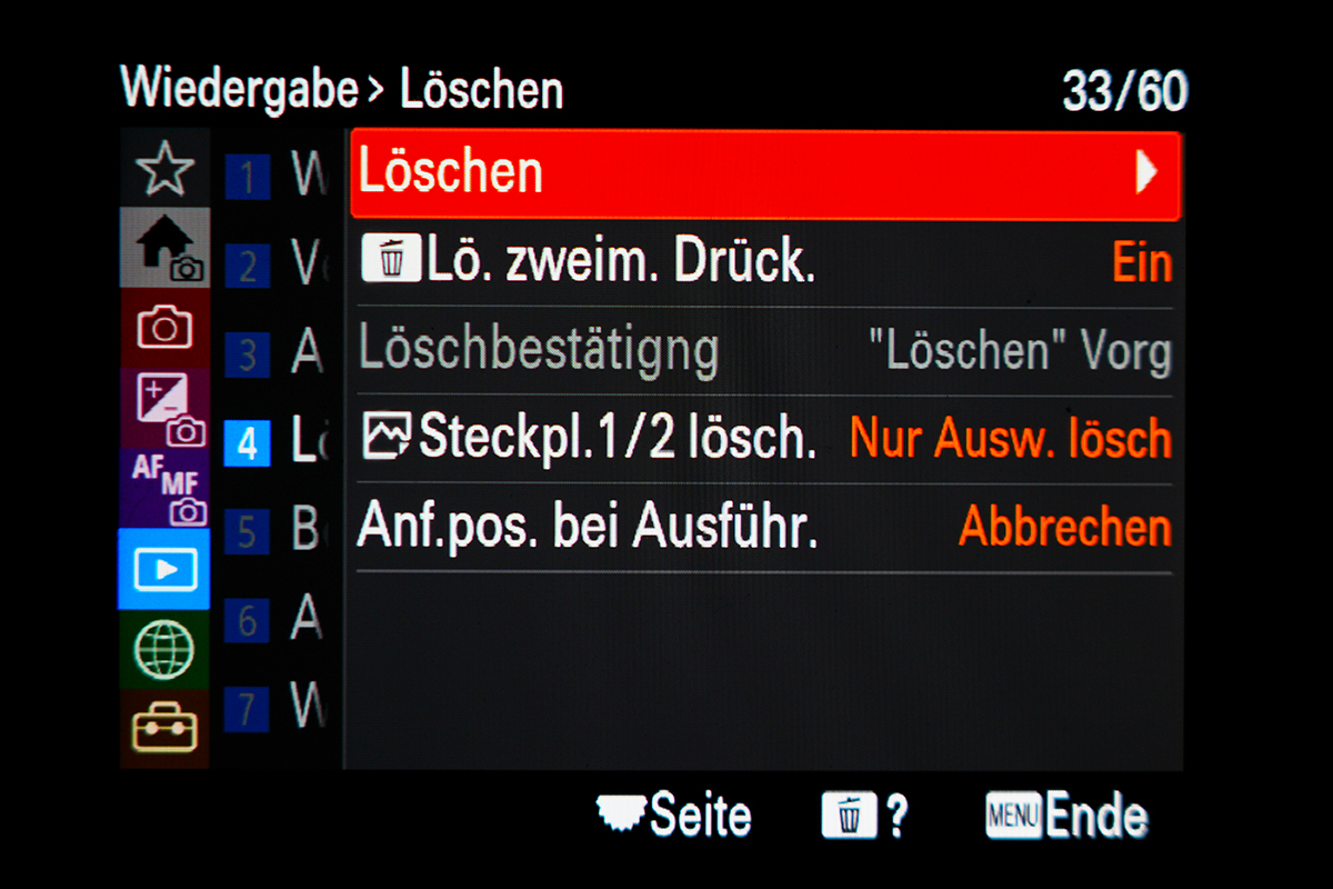 Das XS Fokusfeld arbeitet sehr zuverlässig und allgemein funktionierte der Vogel-Augenfokus sehr gut. Ist aber noch zu früh um genaueres bezüglich "Performance" sagen zu können. Eine Sache ist mir dann eben noch aufgefallen, als ich eine Serie löschen wollte. Ich nutze die Funktion mit "doppelt Mülleimer drücken" für sofort löschen. Es gibt mit dem Update nun die Möglichkeit auf beiden Karten gleichzeitig zu löschen, daher erscheint aktuell eine Abfrage, was genau man löschen will. Also im Menü etwas umgestellt um wieder das schnelle löschen mittels der "Mülleimer-Taste" nutzen zu können. Jetzt war zwar die Abfrage weg, aber nach dem löschen kam immer eine Meldung: Abgeschlossen -----[OK] Also konnte man zwar schnell löschen, aber musste immer diese Meldung wegdrücken, ärgerlich. Nach einigem ausprobieren habe ich jetzt diese Einstellung: → Bild in der Galerie Nun kommt nach 2x Mülleimer drücken wieder direkt das vorherige Bild / Serie. |
