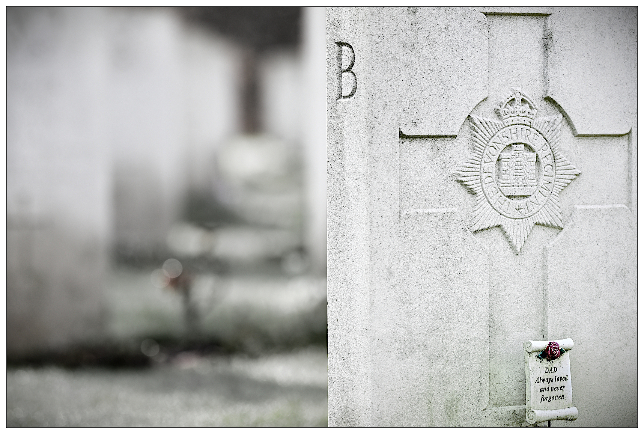 fotografisch eine Augenweide. Eine großartige Serie. Du hast mit vielen Stilmitteln gespielt, die wir von Dir kennen. Jedes Bild wohl überlegt, jedes Bild für sich trägt eine andere Aussage in sich. Dazu die s/w Bearbeitung. Fotografisch passt alles Aber Fotografisch ist nicht alles. Wichtiger als die Anwendung fotografischer Stilmittel ist die Wirkung auf den Betrachter, den die Bilder auslösen. irmis Verluste machen mich tief betroffen. Wie schrieb ich gestern im Monatsthema Stille zu diesem einen Bild: Stilles Gedenken passt hier einerseits wunderbar. Jeder einzelne der Grabsteine hat Ehepartner, Verwandte und Freunde, die dem/der Toten in Stille gedenken. Dein britischer Besucher war wahrscheinlich einer von denen. Anderseits macht es mich wütend, so viele Steine hier zu sehen. 7672 Grabstätten um genau zu sein. Gestorben, um einen Krieg zu beenden, den die Briten / die Soldaten des Commonwealth nicht begonnen haben. 7672 persönliche Schicksale. 7672 zu früh verstorbene. 7672 zerstörte Hoffnungen. Was mich freut, wie gepflegt dieser Friedhof rüberkommt. Und auch hier (wie in Arlington, Va) liegen Menschen verschiedener Religionen nebeneinander. Arlington kennt nur - wenn überhaupt - die kleine amerikanische Flagge als Schmuck, hier stehen Gestecke vor den an sich gleichen Grabsteinen. Am meisten betroffen hat mich dieses Bild gemacht. Fotografisch ist es das einzige nicht 100% s/w Bild. Aber hier kann ich die Trauer des Kindes nachvollziehen. Ein Vater, der gefehlt hat. Eine Mutter, welche die Last alleine zu tragen hatte. Dieses kleine Tafel sagt so viel aus. Und sie nimmt uns mit in die Vergangenheit. Danke für die Aufnahmen. Danke für das Zeigen Gruß Jürgen |