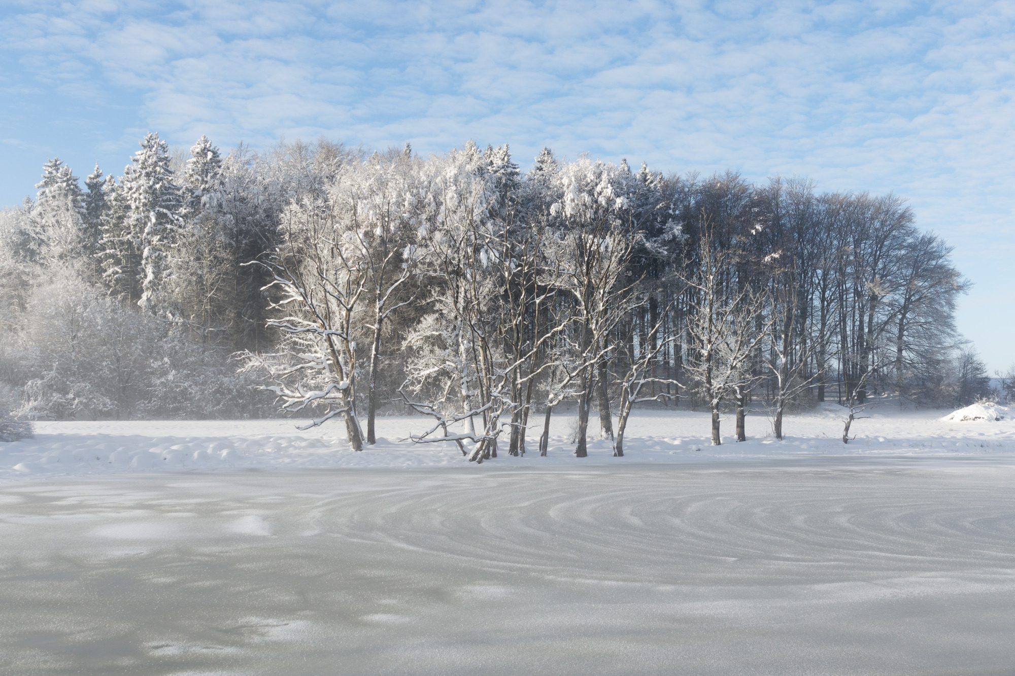 Danke, Peter. Ich nehme an, daß der Wind beim Zufrieren des Teiches ordentlich geblasen hat und dadurch den Schnee so wellenförmig verfrachtet hat.