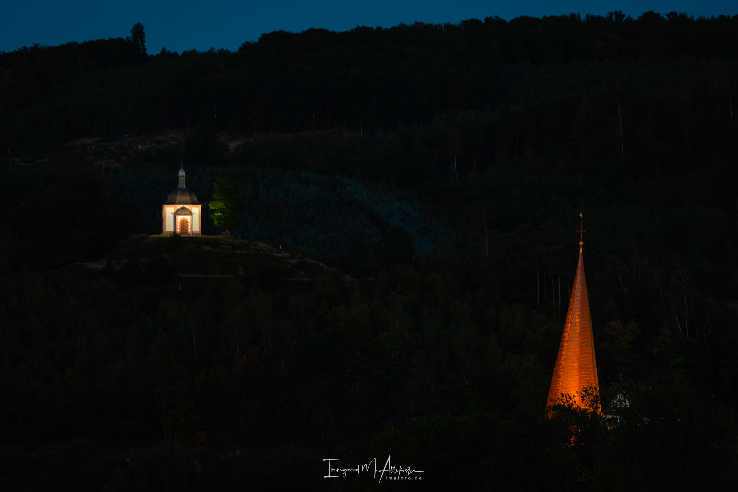 Oben auf dem Berg die Rehberg Kapelle und im Tal der schiefe Kirchturm von Sundern-Stockum.