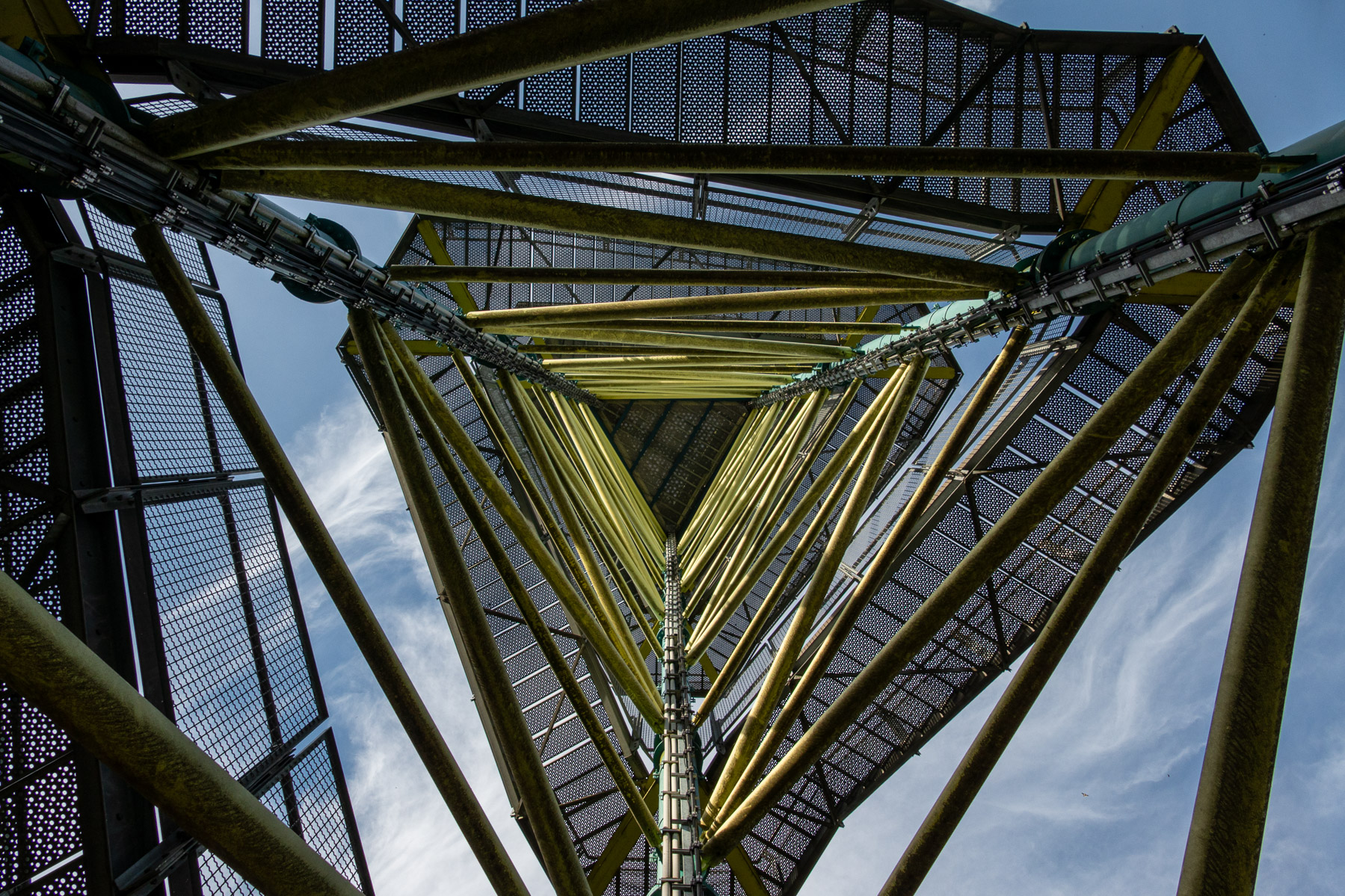 Kiwi05 Wir blicken im Inneren des Aussichtsturmes Käflingsberg gut 55 Meter senkrecht nach oben. Aus dem äußeren durcheinander der Streben kristallisiert sich zur Mitte des Bildes hin eine klare Dreiecksstruktur heraus, die nach oben im Licht der Sonne glänzt. Ein Gitter verhindert den Durchblick zum Himmel. Sicher hast du damals, zu Beginn deines Ruhestandes, den Turm noch ohne außer Atem zu kommen, bestiegen. Ein feines, zum Thema passendes Foto.