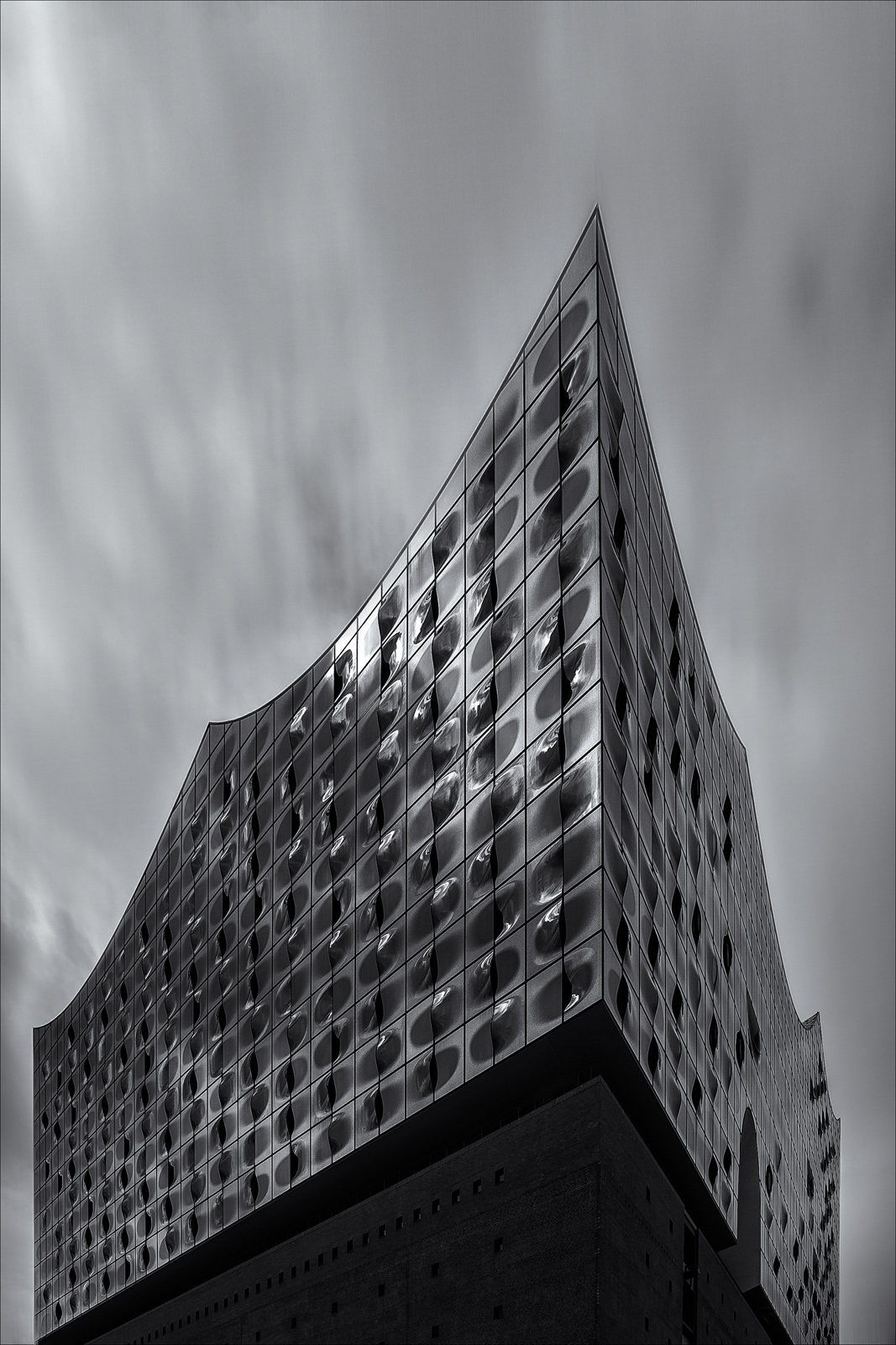 Haribee Sonne lacht - Blende 8, auch wenn die Wolken einen etwas bedeckten Himmel vermuten lassen. Einem Schloss gleich baut sich die Fassade der Elphi vor einem auf. Gleichfalls werden auch Assoziationen an einen Ozeandampfer geweckt. Die lange Kante der Fassade liegt im „goldenen Schnitt“ und gibt dem Bild die nötige Spannung. Die SW-Umsetzung ist ebenfalls passend. Gut gemacht und die Elphie ins richtige Licht gesetzt. Was will man mehr. Eine ähnliche Aufnahme habe ich auch in meiner Sammlung.
