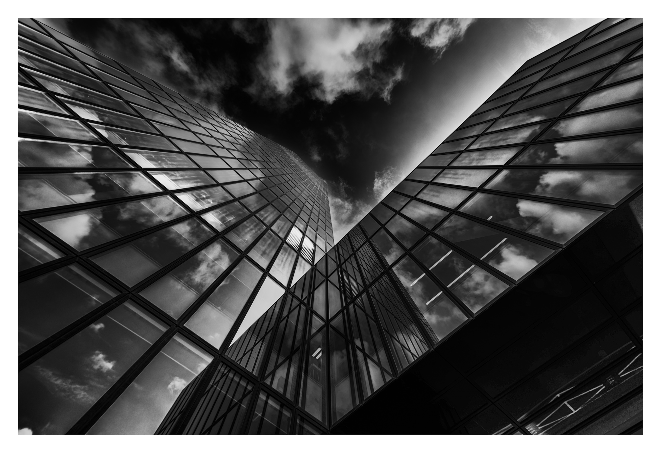 JqschJürgen entführt uns nach Basel. Er zeigt uns einen Klassiker der Fassadenfotografie. Der im rechten Winkel angeordnete Gebäudekomplex lässt die Spiegelungen der Fassade im jeweiligen anderen Gebäudeteil zu. Diese Spiegelungen machen das Foto interessant. Ich hätte die noch sichtbaren Fragmente der Gebäudestruktur rechts unten wahrscheinlich im Schwarz verschwinden lassen. Die S/W Umsetzung finde ich passend. Ich frage mich warum du bei einer ISO von 200 ein Entrauschungsprogramm bemühen musstest.