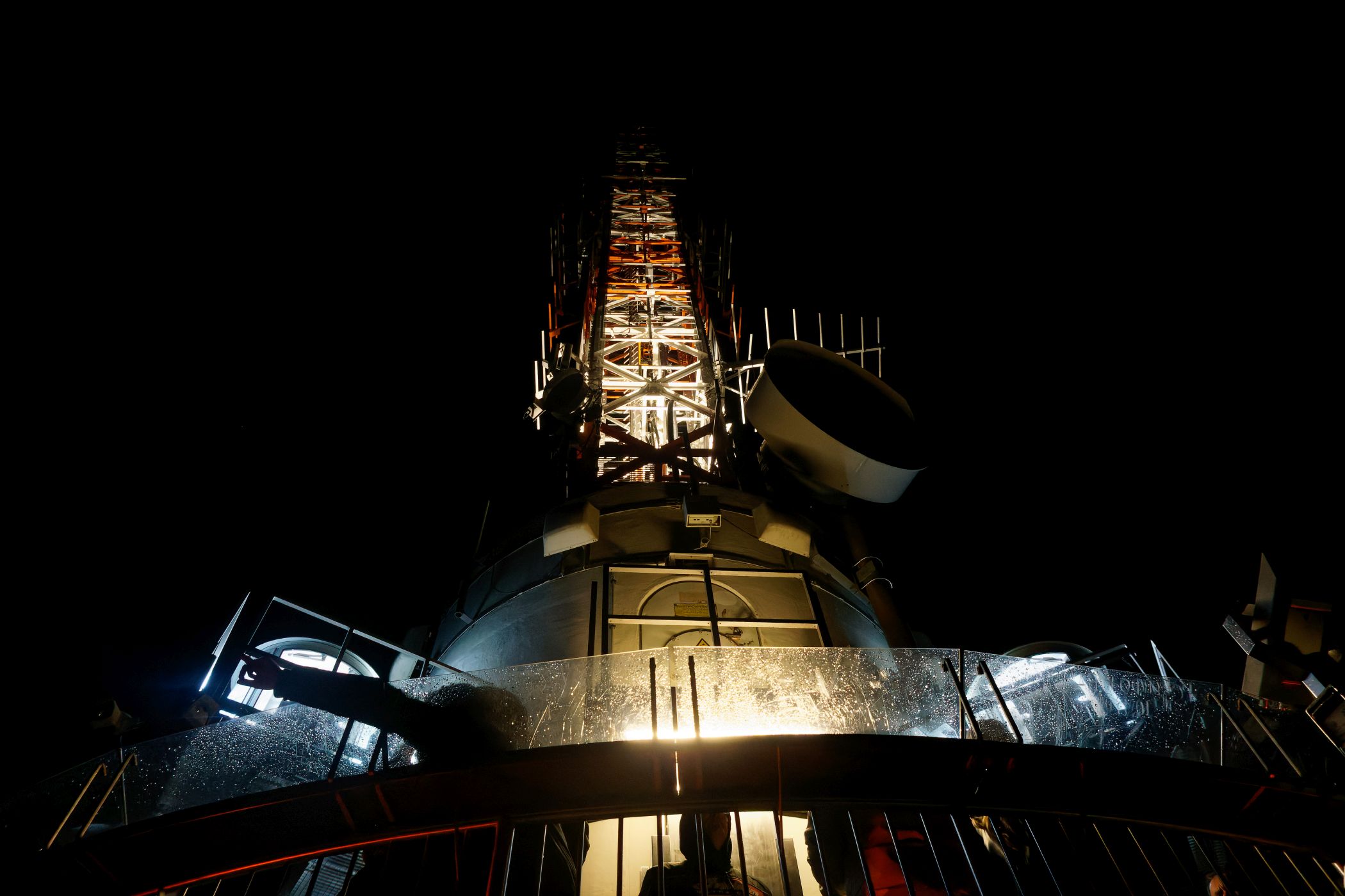 JoZVier sind 3 Fotos zu viel. Ich greife aus deiner Sammlung mal das erste heraus, da es für mich, im Gegensatz zum Zweiten, die interessantere Perspektive hat. Von der vorletzten Etage richtet sich dein Blick auf die Antenne des Funkturms. Die Spitze des Antennenmastes scheint in der Unendlichkeit des Himmels zu verschwinden. Hochoben von Unten auf den Sensor gebannt, passt. Spektakulär wäre natürlich, wenn der Sternenhimmel noch sichtbar gewesen wäre, aber die verbliebenen Wassertropfen an den Scheiben lassen eher auf regnerisches Wetter und verhangenem Himmel schließen. Zudem würde der Dynamikumfang der Kamera ein solches Spektakel nicht zulassen.
