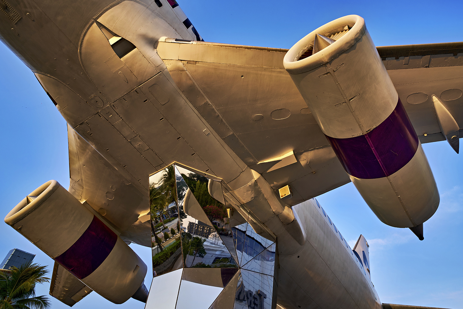 H-K-BGanz frisch aufgenommen dachte ich zuerst, dass wir uns auf/in einem Flughafen befinden, in dessen Teil ausrangierte Flugzeuge präsentiert werden. Eine kurze Recherche im Internet führt uns aber in das Einkaufszentrum „Terminal 21“ mitten in Bangkok. Eng und von Straßen auf unterschiedlichen Ebenen umgeben, erlaubt selbst Google-Earth keinen überschaubaren Blick auf das Zentrum. Zum Foto: Flugzeug von unten auf einem „Ständer“ aus verspiegelten Glasflächen. Die 18mm engen den Blickwinkel schon sehr ein und lassen die Dimension des Flugzeugs nur erahnen. Mich würde der Blick von unten mit 10mm, oder 12mm interessieren.
