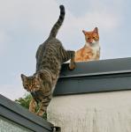 catfriendPIWir sehen hier zwei unterschiedliche Charaktere, der eine mutig und vielleicht etwas tollpatschig, während der andere den entspannten und aufmerksamen Beobachter gibt. Der Moment ist perfekt erwischt, die Bewegung des vorderen Katers macht das Bild lebendig und witzig. Die diagonale Linie des Dachs führt den Blick direkt zur Aktion. Der zweite Kater balanciert das Bild schön aus. Der Himmel könnte mehr Struktur haben und die Schärfe, gerade auf dem Gesicht des vorderen Katers, könnte noch etwas knackiger sein. Aber ein themenkonformes und tolles Bild! Trotzdem kommen jetzt die Kater auch auf die Blacklist.