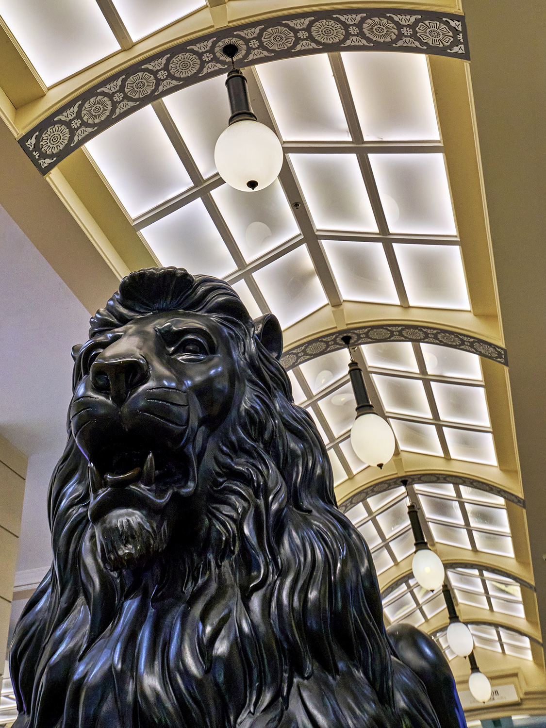 K-H-BDer Löwe, der Löwe, der Löwe ist los! schallt es ziemlich blechern aus der Augsburger Puppenkiste. Die Irrungen und Wirrungen des Zöglings KHB führen uns immer noch im Terminal 21 herum, nach Paris nun offensichtlich Augsburg. Schön anzusehen, wie die Lampen von rund nach eirig mutieren, während der Löwe sich genüßlich die selbigen kraulen lässt. Aber so tief wolltest Du offensichtlich nicht sinken.
