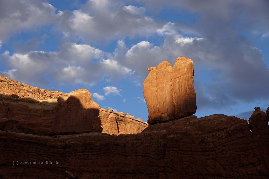 Jetzt aber von Anfang an. Wenn man von Moab / der Moab Fault die Serpentinen zum Arches national Park hochfährt, springt einem gleich das Kamel ins Auge:
