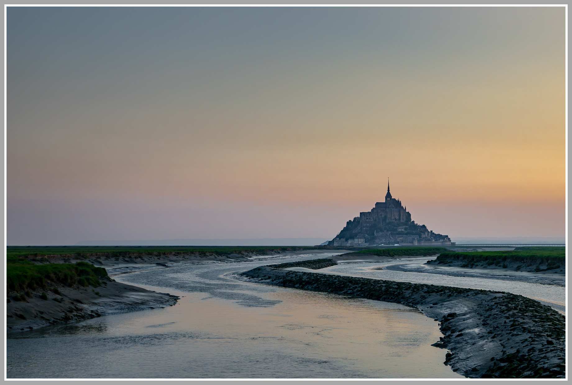 Wenn man früh morgens, 2 Stunden bevor die ersten Shuttle-Busse eintreffen, zu Fuß auf Le Mont-Saint-Michel zugeht, kann man Stille und Lichtstimmungen über der Meeresbucht genießen. → Bild in der Galerie