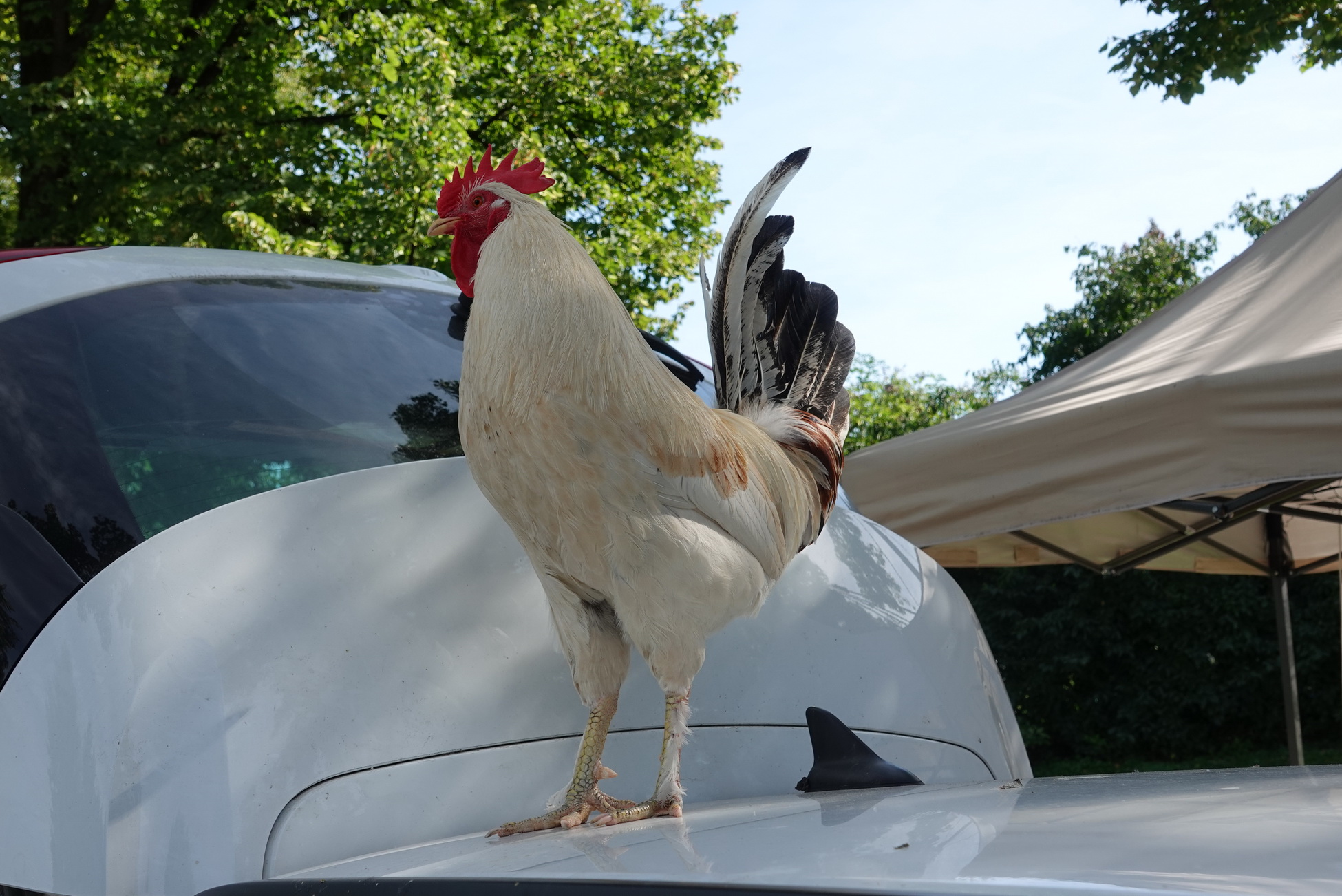 Herr Gockel sieht sich das Geschehen von oben an: