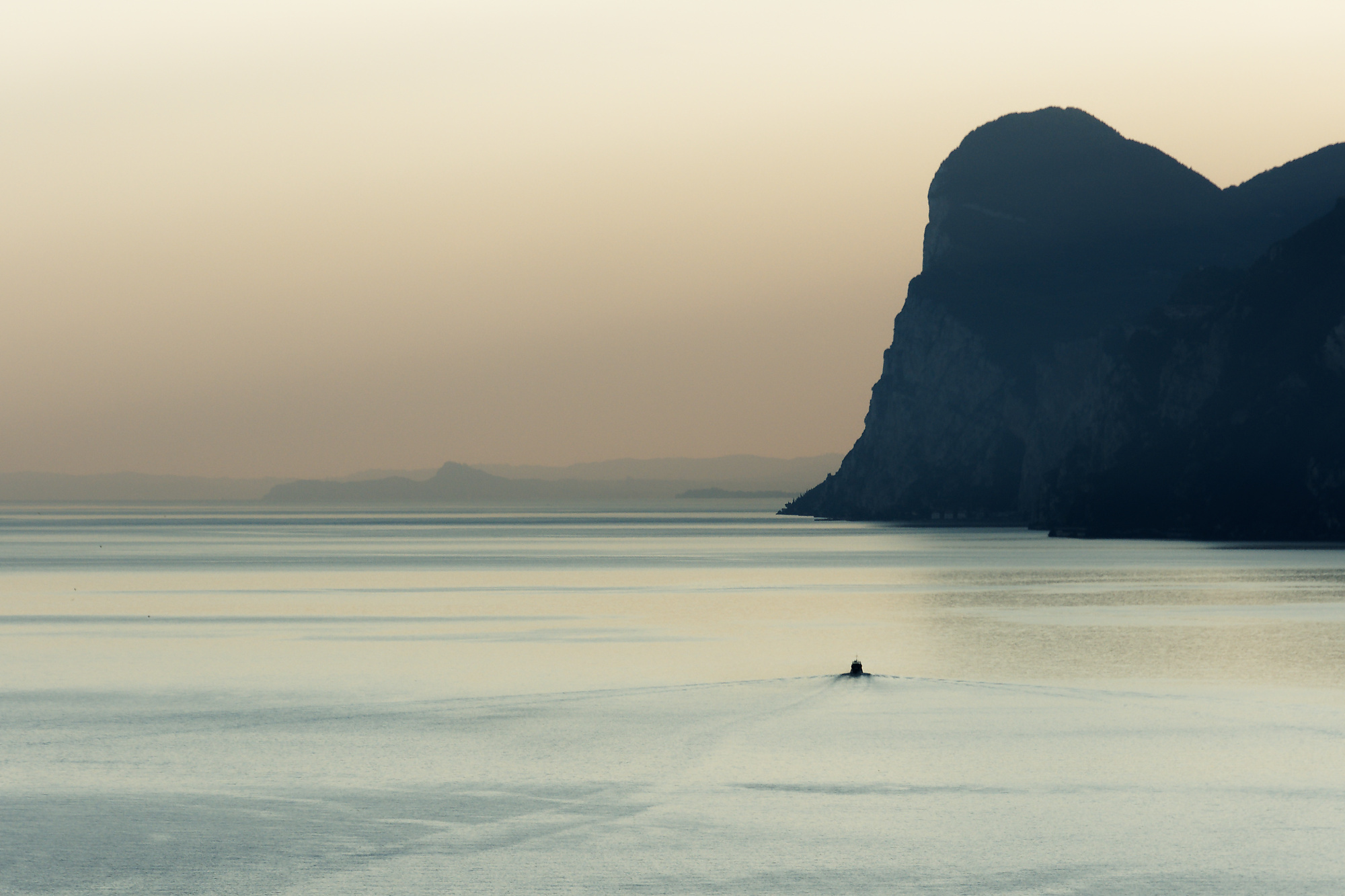 Monte Castello Still ruht der Berg im letzten mittseptemberlichen Tageslicht, in diesem Fall der Montecastello, selbst wenn man dessen berühmte Wallfahrtskirche nicht erkennt. Die Atmosphäre, die Du hier stilsicher eingefangen hast, Bruno, passt zur Jahreszeit, mithin dem Übergang vom Sommer zum Herbst, der gern mal verbunden ist mit sentimentalen Gefühlen und getaucht in besonderes, sanftes Licht. Nur sag mal bitte, was schwimmt da im Vordergrund auf dem Gardasee und hinterlässt dabei eine sichtbare Spur im dahindämmernden Wasser? Ein Wasservogel, so würde ich sagen, ist es nicht. Ein kleines Uboot, dessen Turm herausschaut, hoffentlich auch nicht. Vielleicht ein ferngesteuertes Modellboot? Ich kann mir schlicht keinen Reim darauf machen…