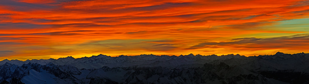 Alpenglühen, es war das erste Foto, das ich bei Sonnenaufgang gemacht habe. Ein Pano aus 7 Hochformataufnahmen bei 200 mm.