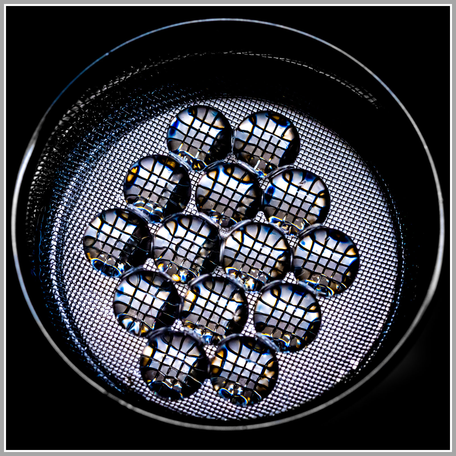 Erneut ein kreatives Bild deinerseits Peter.. Sind es Wasserperlen oder Glasperlen. Auch die Drahtunterlage gibt mir Rätsel auf. Die Reflexionen sind wirklich toll. Gefällt mir gut.