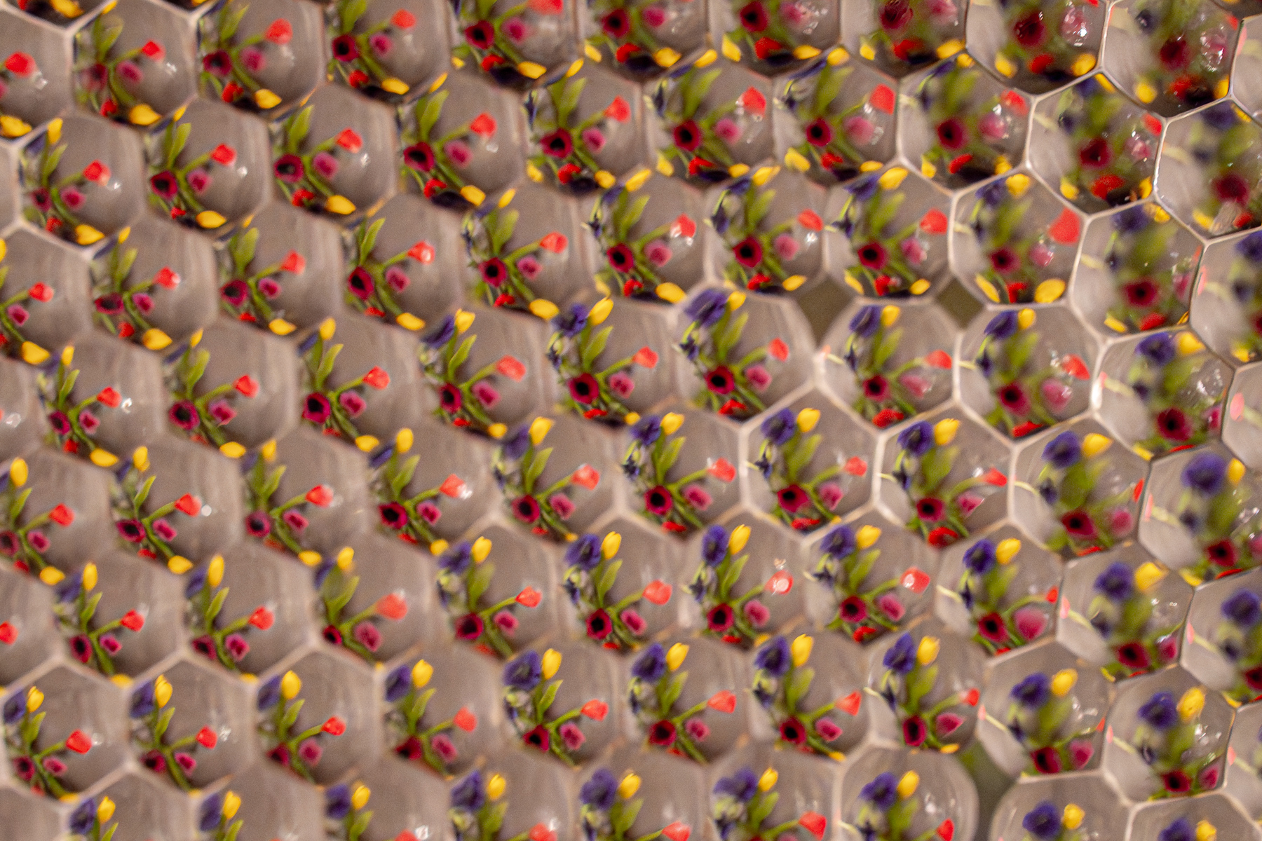 Warum erinnert mich dein Bild an die Zeiten, wo man in Zeitschriften zwei Bilder zeigte und den leser aufforderte, die 10 Fehler zu finden. Hier: Welche Waben sind nicht wie die anderen? Du gibst den Hinweis auf die Facettenaugen von Insekten. Das was mich hier stört ist das starke Rauschen, aber Insekten sehen ja auch nicht alles scharf.