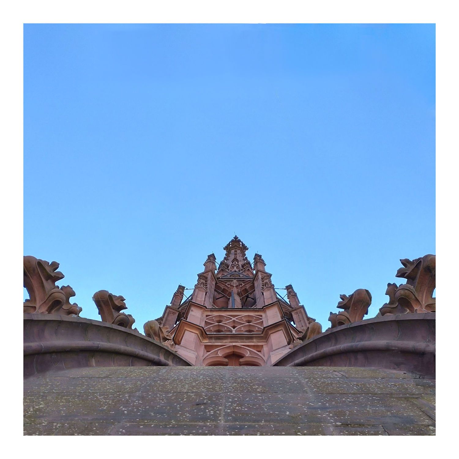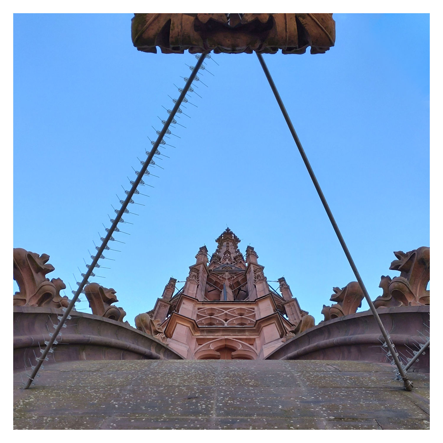 Die Idee war, die Turmspitze mit vorhandenen Elementen einzurahmen, dazu bot sich das Dreieck aus den Stangen irgendwie an. Die gehen über den Standpunkt hinüber zum äußeren Rand des Turmes. Das sieht man auf dem Bild aber nicht wirklich, und sind dann wohl als Rahmen doch zu wenig attraktiv.