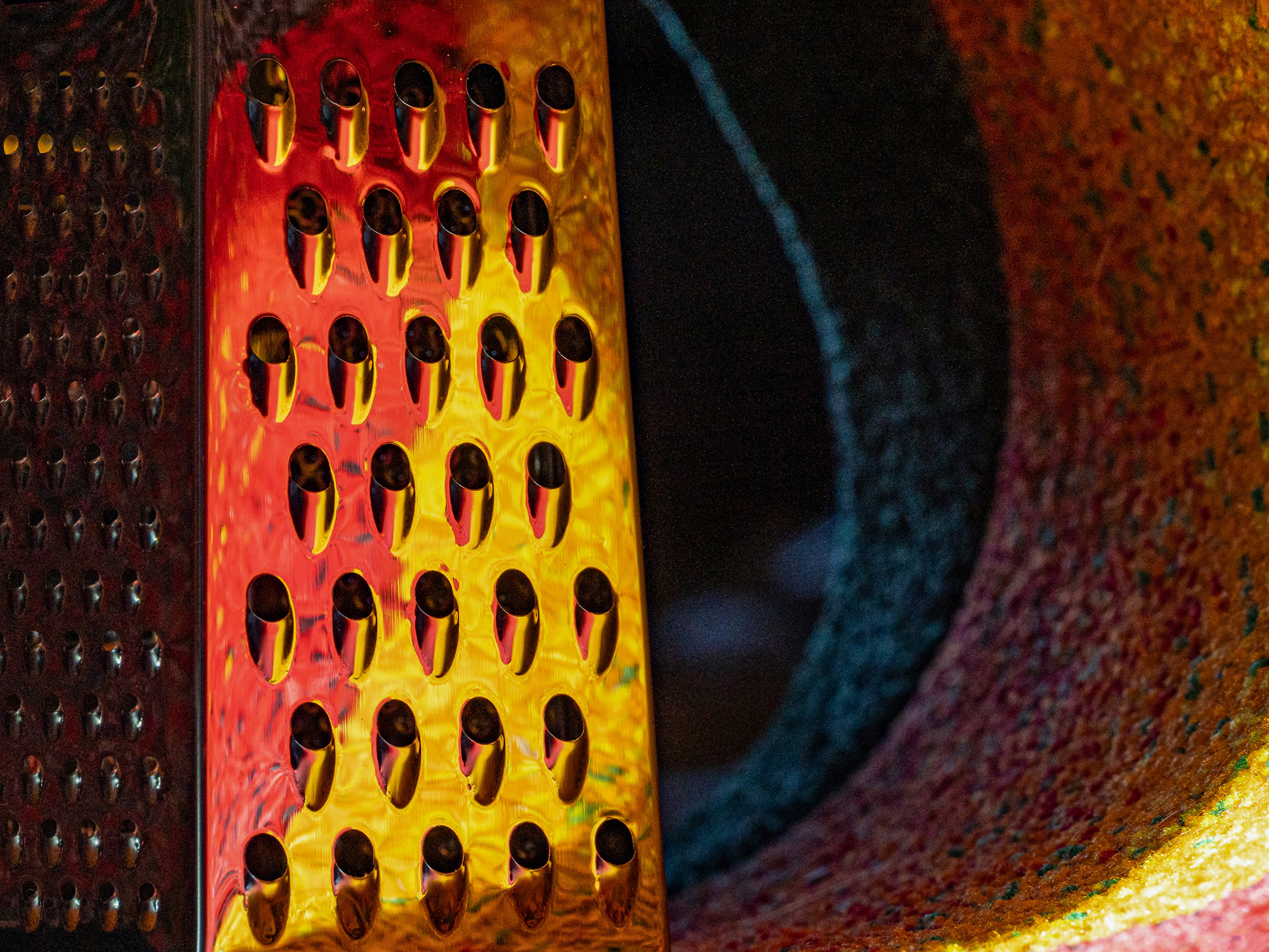naja die Reibe wurde nicht mit 2 verschiedenen Farben angeleuchtet. Die Situation war viel einfacher... Ich habe die Reibe auf einen bunten Teppich gestellt und den Teppich darüber gelegt. Den Teppich habe ich dann mit einer Taschenlampe angestrahlt. Hierdurch wurde die Farbe auf die Reibe reflektiert