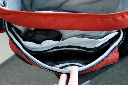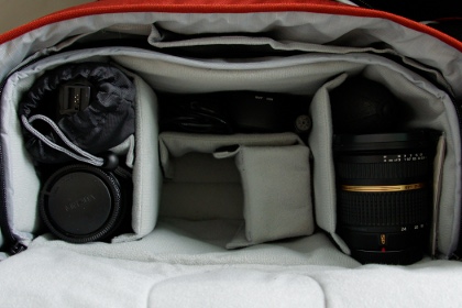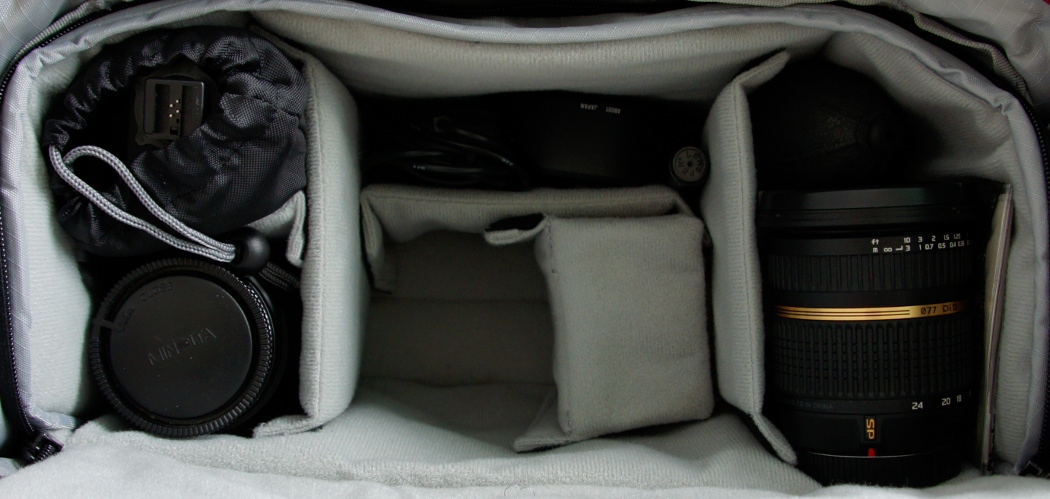 Wichtiges Kriterium Packeffizienz: Im Flipside wird viel Raum rund um die Kamera verschenkt, weil die Objektive senkrecht zum Objektiv am Body verstaut werden. Genauer: Wenn man den Rucksack flach hinlegt, liegt die Kamera wie beim Fotografieren im Rucksack, aber die zusätzlichen Objektive (können) aufrecht stehen. Man kann die Objektive natürlich auch liegend verstauen, bekommt dann aber deutlich weniger hinein und verschenkt weiteren Raum. Daraus resultiert ein weiterer Nachteil: Da ein Objektiv einmal längs und einmal aufrecht verstaut wird, je nach dem ob es auf der Kamera ist, oder nicht, benötigt man unterschiedlich viel Platz für seine Ausrüstung, wenn man das Objektiv an der Kamera wechselt.