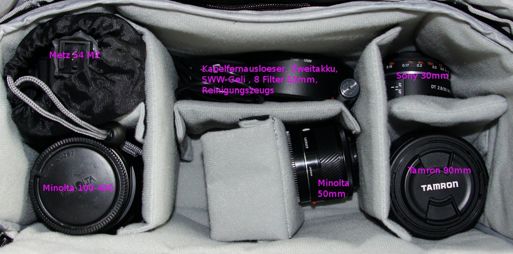 Lowepro Slingshot 200: Keine Chance das Minolta 100-400 sinnvoll hinein zu bekommen.