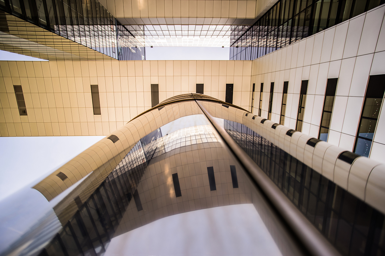 Ich versuche es mal: Die Aufnahme zeigt auf den ersten Blick nach vorne. Tatsächlich ist der Blick nicht nur senkrecht nach oben zu sehen, sogar noch ein Stück nach hinten ist mit drauf. Es ist mit einem Fisheye gemacht.