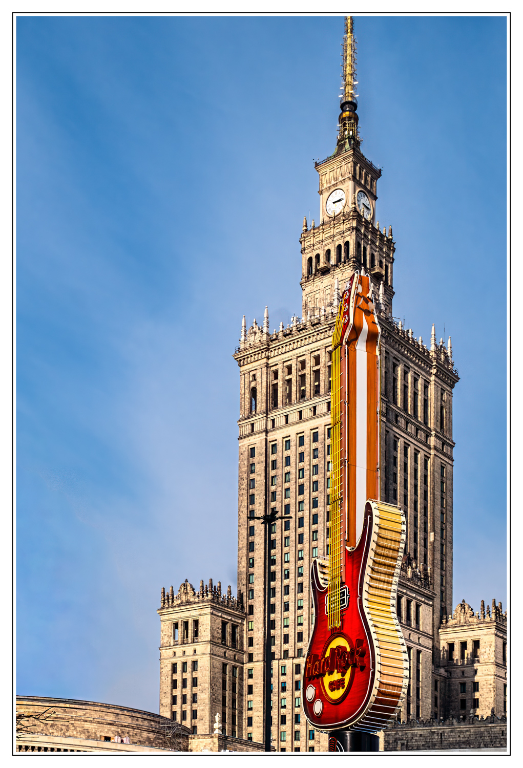 Wir waren, wie Du weißt, letzten August dort, bei tropischen Temperaturen, und hatten dabei andere fotografisch-architektonische Schwerpunkte, etwa die Altstadt mit ihren Freisitzen, die Parks und Grünanlagen sowie das Weichsel-Ufer. Nur das Hardrock Café am Kulturpalast mit der markanten Gitarre (Bild 1) haben wir natürlich auch abgelichtet.