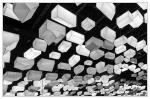 Wenn man die ersten sechs Säle der Geschichte der polnischen Juden durchschritten hat, kommen jetzt noch drei Säle mit der neueren Geschichte ab 1850. Zur Erholung wurde dort ein "Pausenraum" eingerichte. Man kann sich erstmal ein wenig ausruhen. Hier die Deckenlampen, die wohl an ein jüdisches Dorf Schtetl erinnern. Die Lampen wechseln ihre Farben mit der Zeit. Hier eine s/w Aufnahme, die sich auch noch in einer Spiegelfläche spiegelt.
