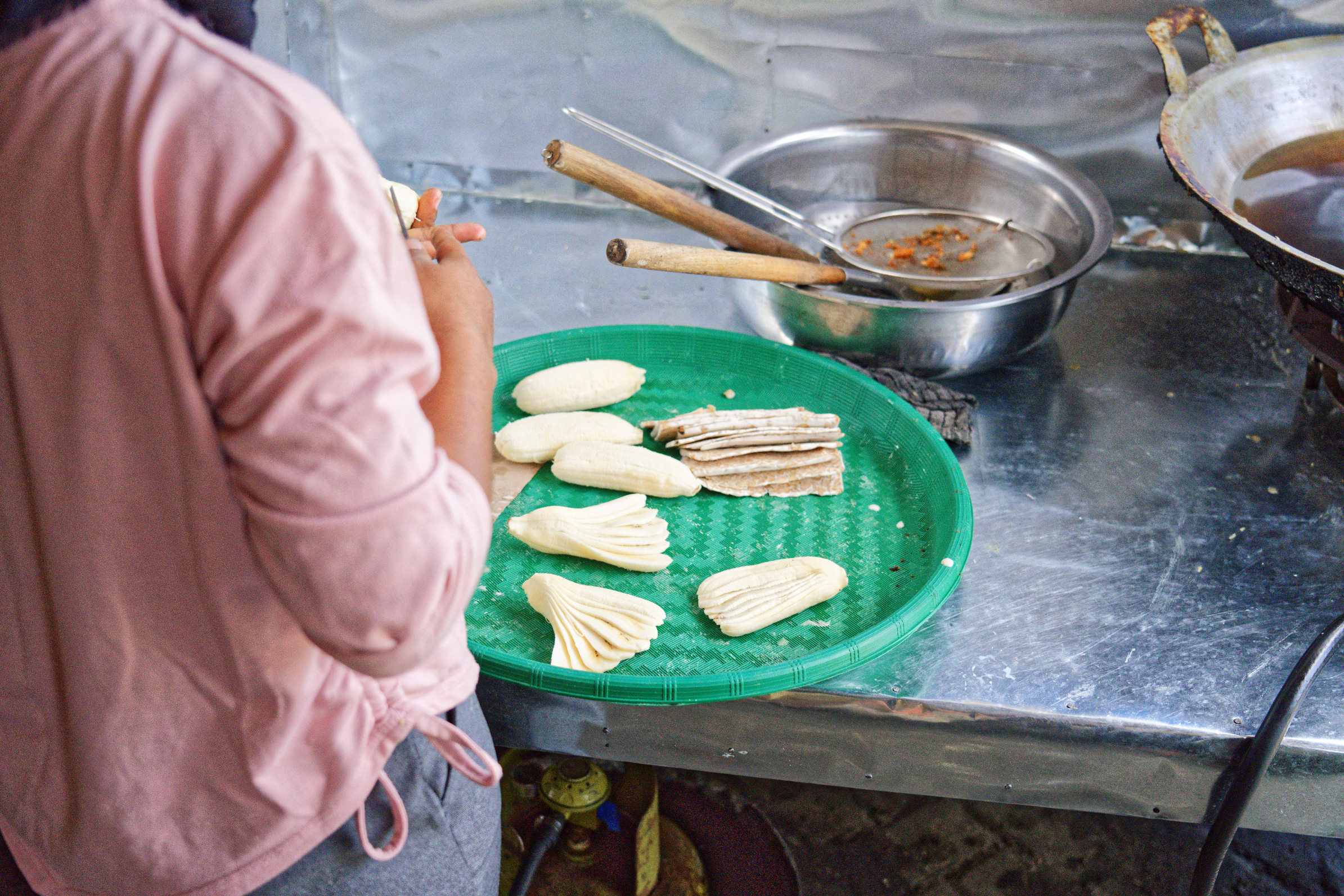 Wir genossen auch leckere frittierte Bananen am Straßenrand. Hier die Herstellung davon: