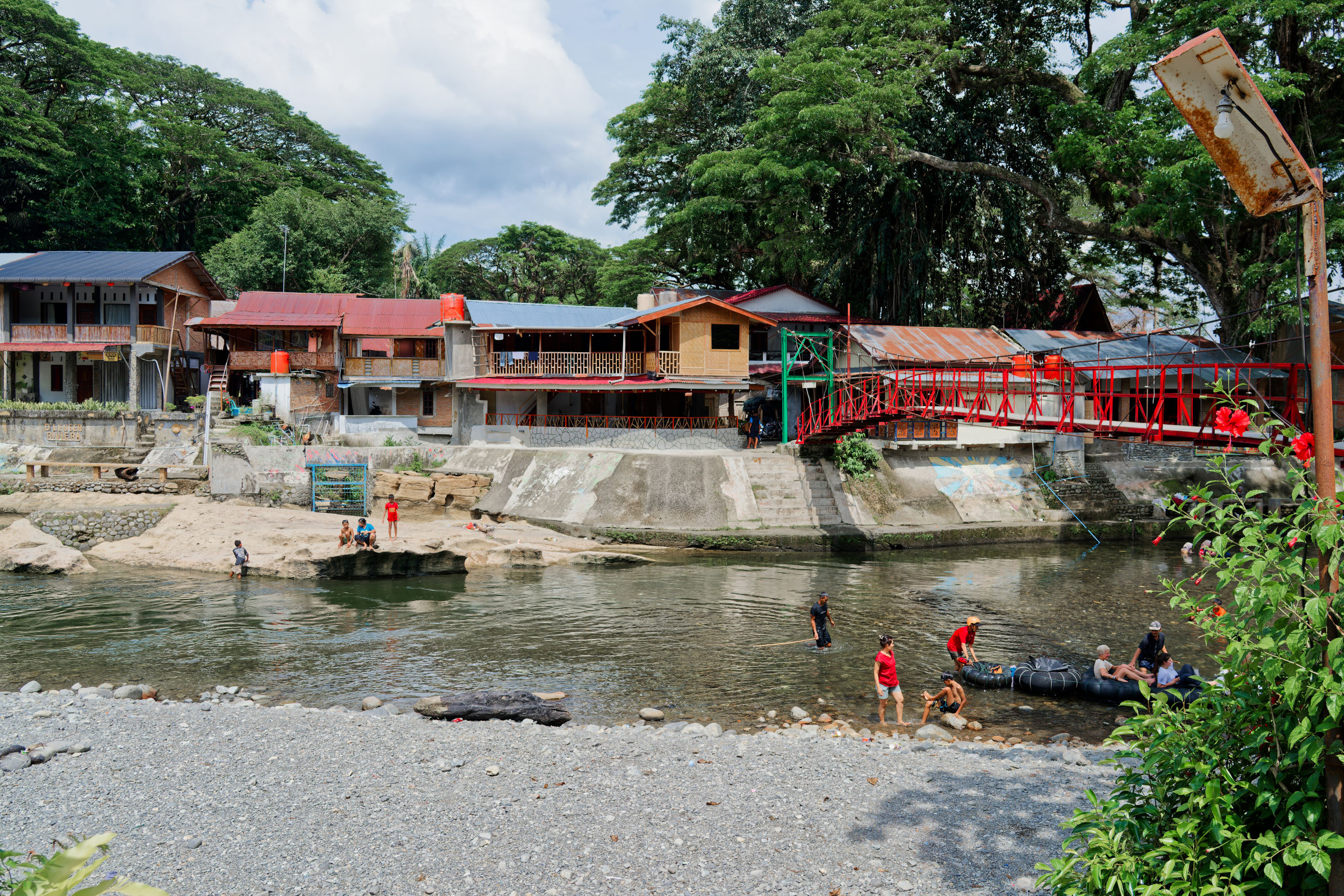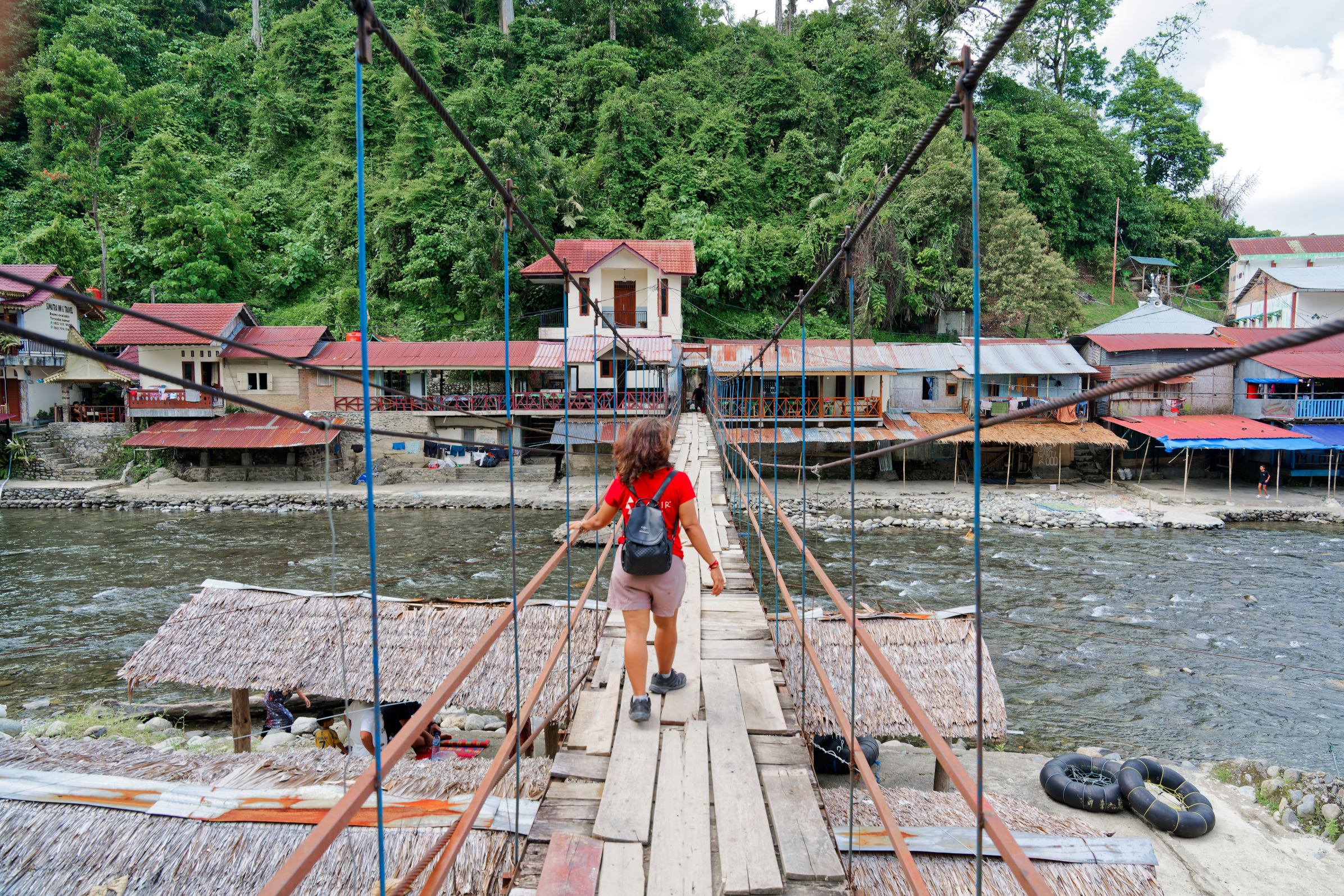 Wir fuhren dann weiter bis Bukit Lawang. Das Dorf liegt entlang des Bahorok Flusses, der es in zwei Hälften teilt. Viele schwingende Hängebrücken führen darüber.