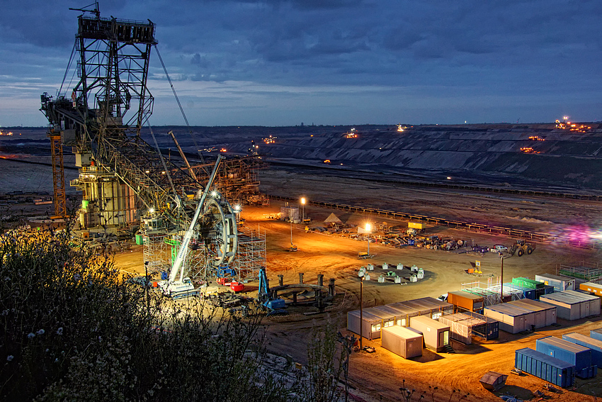 Im Tagebau Garzweiler wurde an einem Bagger, das Schaufelrad ausgewechselt. Im Moment befindet sich das neue Schaufelrad schon am Bagger, nur die einzelnen Schaufeln fehlen. Dort wo der blaue Bagger steht, wurde das alte Schaufelrad, in seine Einzelteile verlegt und der Verschrottung zugeführt. Die Arbeiten werden in 3 Schichten durchgeführt und somit wird auch in der Nacht, weitergearbeitet. Genauso, wie im Hintergrund die Absetzer, welche auf mehreren Ebenen, den Tagebau wieder verfüllen.