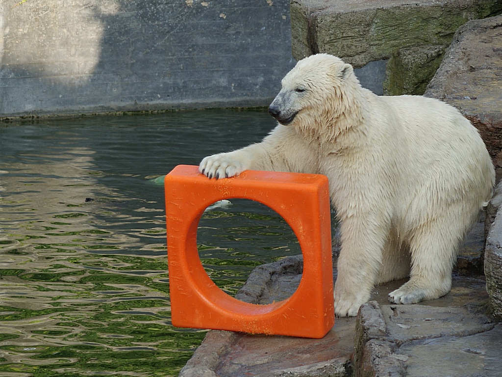 Eisbär Arktos (Tiergarten Schönbrunn in Wien) demonstriert die Widerstandsfähigkeit des Plastik-Objektes |
